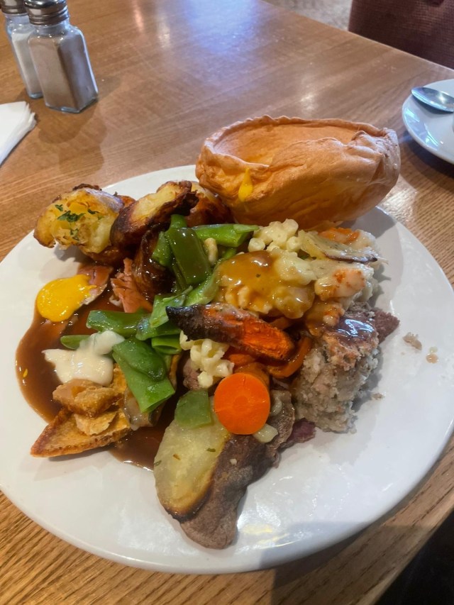 Thus meated, I moved on to the self-service sides — macaroni and cheese, stuffing, sliced mangetout, peas, municipal coins of boiled carrot — and then the cauldron of thickly emulsified, brown goop labeled as “Toby’s Famous Gravy”. As is often the case at a self-service buffet, greed, panic and poor planning produced a plate of utter chaos: a vast slop-pile of vegetables, proteins and stray peas, a Bash Street Kids nightmare.