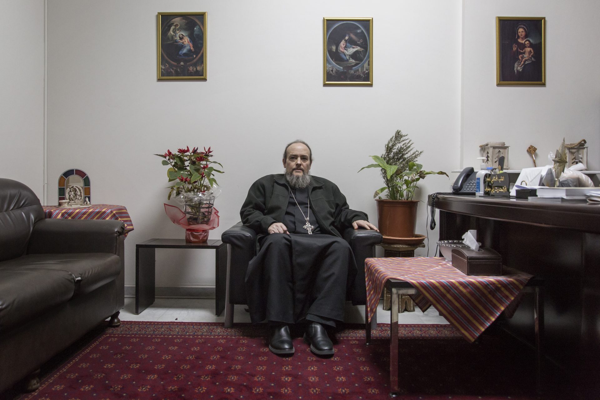 “As a church we keep saying that we are Lebanese and must support each other and pray for everyone affected,” says Father Elie Maalouf before he delivers his mass. “The trouble is, before there were shared goals. Today everybody is working towards their own ends.” He looks tired as he finishes rolling a cigarette and pours himself another coffee from a thermos, as though there is nothing new in this story. “From long ago Israel has tried to divide. We tell people to be aware of this because when they leave we will still be living together.”
